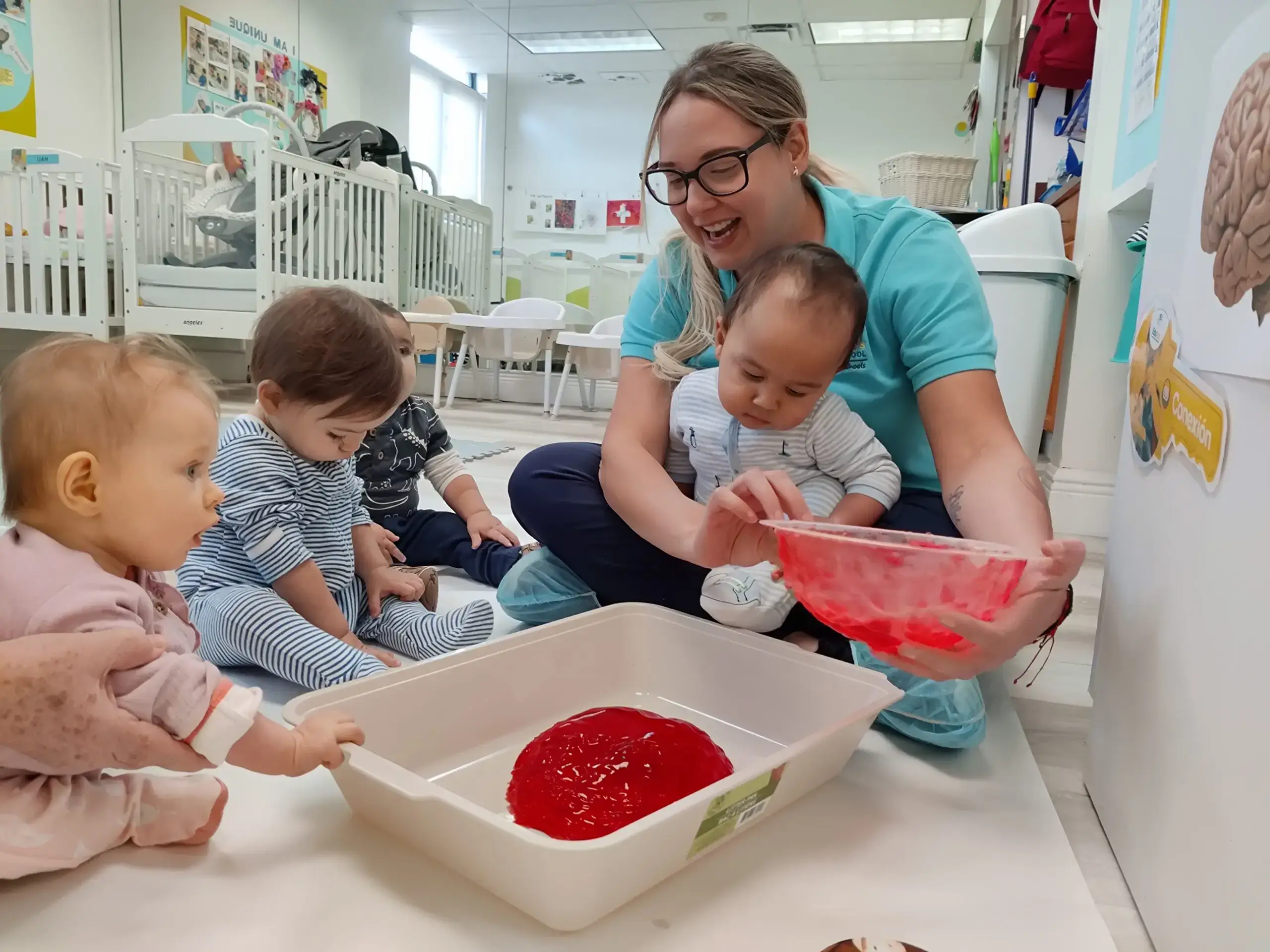 Babies are in constant discovery of how the world works. Teachers actively observe babies’ interests, plan experiences accordingly and guide them to explore these through their senses. They model advanced thinking language to describe the experiences babies are living to help them make sense of what they are experiencing. Click to learn more...